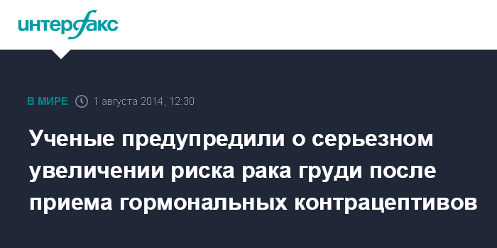 Москва. 1 августа. INTERFAX.RU - Прием некоторых гормональных контрацептивов может временно повышать риск развития рака груди до 50%, сообщает The Independent. К такому выводу пришли ученые из американского Fred Hutchinson Cancer Research Center.