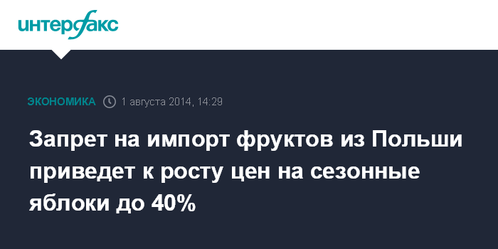 "Запрет на поставки яблок из Польши приведет к изменению географии импорта, потребует дополнительных временных и финансовых затрат, а это приведет к росту цен на так называемые дешевые "сезонные яблоки", к которым привык потребитель, рост цен в конце года может достичь 30-40%", - заявила Тюрина "Интерфаксу".
