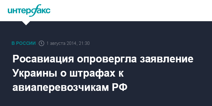 Москва. 1 августа. INTERFAX.RU - Заявление Госавиаслужбы Украины о правомерности штрафных санкций в отношении российских авиакомпаний, выполняющих полеты в российский аэропорт Симферополь, является недостоверной информацией, сообщило Федеральное агентство воздушного транспорта РФ (Росавиация).