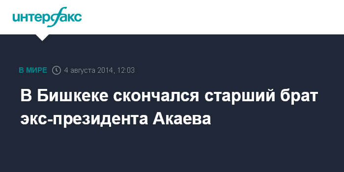 Москва. 4 августа. INTERFAX.RU - В Киргизии умер старший брат экс-президента Киргизии Болот Акаев, сообщило в понедельник радио "Азаттык". По его данным, 81-летний Болот Акаев скончался в Бишкеке 3 августа, где жил вместе семьей.