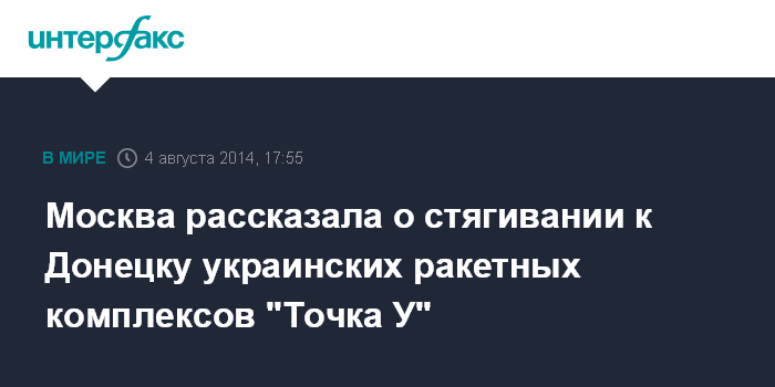 Москва. 4 августа. INTERFAX.RU - Украинская армия продолжает стягивать к Донецку ракетные комплексы "Точка У", а также "Смерч" и "Ураган". Об этом говорится в сообщении, опубликованном на сайте МИД РФ в понедельник.