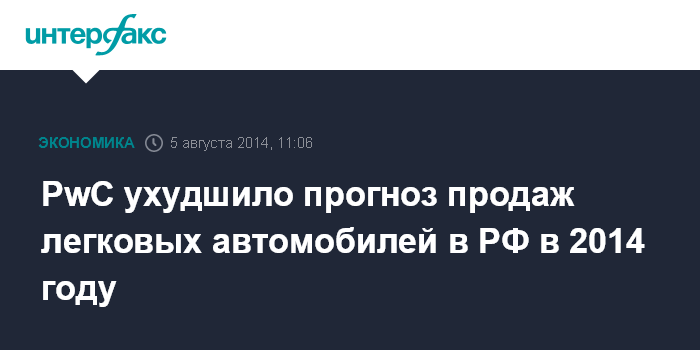 Москва. 5 августа. INTERFAX.RU - Агентство PricewaterhouseCoopers (PwC) пересмотрело прогноз развития рынка легковых автомобилей в России в 2014 году. Аналитики ожидают снижения на 8-12% по сравнению с 2013 годом, сообщил журналистам старший менеджер практики по оказанию услуг компаниям автомобильной отрасли PwC Сергей Литвиненко во вторник в Москве.