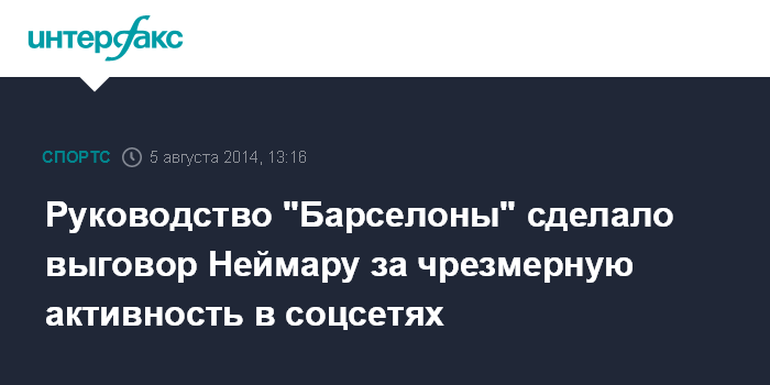 Москва. 5 августа. INTERFAX.RU - Руководство "Барселоны" сделало выговор нападающему Неймару за то, что он слишком активно делится фотографиями и сообщениями в социальных сетях, сообщает AS.