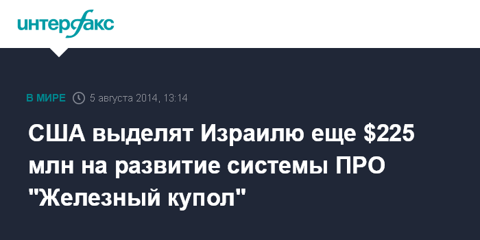 Ранее США выделили Иерусалиму на развитие системы около $700 миллионов. Закон о дополнительной финансовой поддержке системы ПРО Израиля был принят на прошлой неделе единогласно конгрессом США.