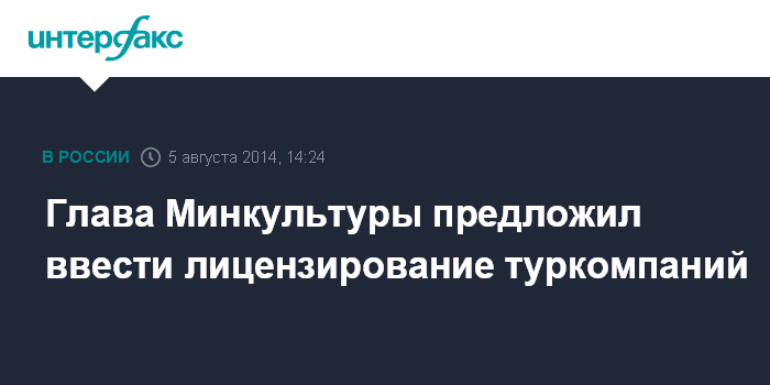 Москва. 5 августа. INTERFAX.RU - Министр культуры РФ Владимир Мединский считает необходимым ввести лицензирование туркомпаний для того, чтобы в полной мере защитить туристов. Об этом он во вторник заявил журналистам.
