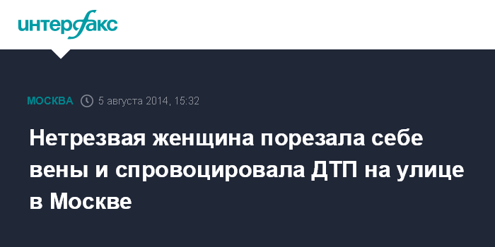 Москва. 5 августа. INTERFAX.RU - Пьяная женщина, порезавшая себе вены на улице на юго-востоке Москвы, набросилась на врачей "скорой помощи", которые везли ее в больницу, чем спровоцировала ДТП, сообщил "Интерфаксу" во вторник источник в медицинских кругах столицы.