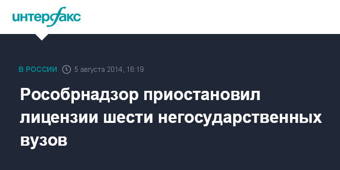 Москва. 5 августа. INTERFAX.RU - Рособрнадзор приостановил действие лицензий на образовательную деятельность шести негосударственных институтов, сообщили "Интерфаксу" в пресс-службе ведомства во вторник.