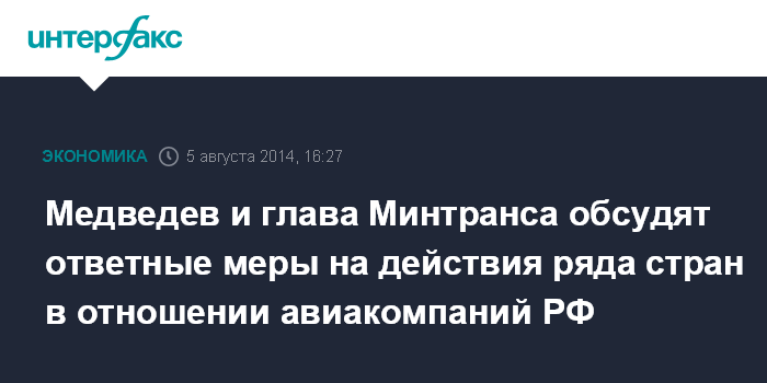 Москва. 5 августа. INTERFAX.RU - Премьер-министр РФ Дмитрий Медведев на встрече с министром транспорта Максимом Соколовым и заместителем гендиректора "Аэрофлота" Вадимом Зингманом обсудит возможные ответные меры на действия ряда государств в отношении российских авиакомпаний.