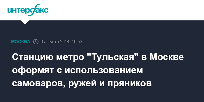 "Конкурс на оформление станции "Тульская" объявлен по инициативе правительства Тульской области и при поддержке правительства Москвы и московского метрополитена. Суть конкурса - декоративное решение уже существующей станции "Тульская" по теме самоваров, ружей, пряников и Левшей с блохами", - сказал Шумаков.