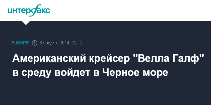 Москва. 6 августа. INTERFAX.RU - Американский ракетный крейсер "Велла Галф" в среду войдет в Черное море, сообщается на сайте командования Шестым флотом ВМС США.
