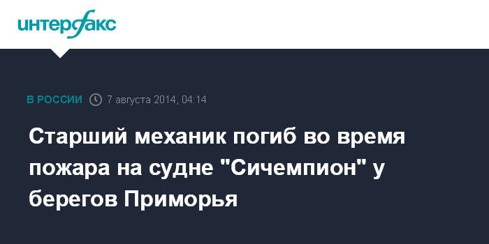 Москва. 7 августа. INTERFAX.RU - Один человек стал жертвой пожара на сухогрузе "Сичемпион", который загорелся у берегов Приморья в ночь на вторник, сообщила агентству "Интерфакс" помощник руководителя Дальневосточного СУ на транспорте СКР Наталья Салкина.