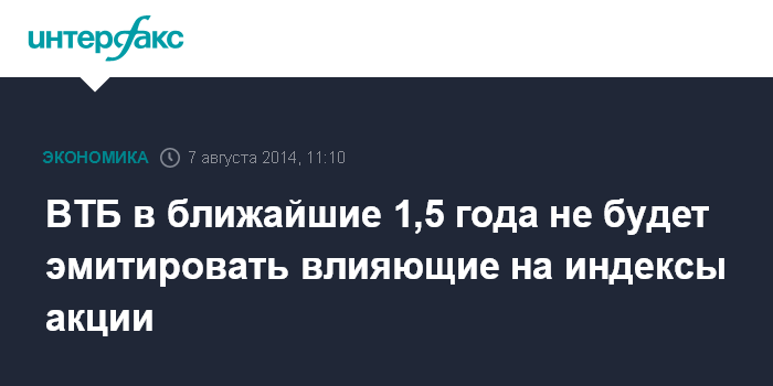 Москва. 7 августа. INTERFAX.RU – ВТБ до конца 2014 года и в следующем году не планирует дополнительные выпуски акций, говорится в заявлении второго по величине банка РФ.