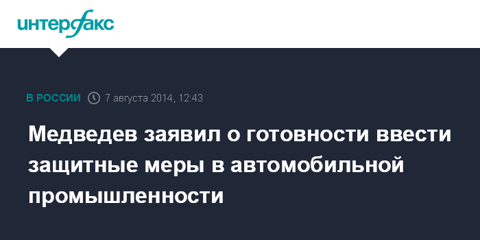 Москва. 7 августа. INTERFAX.RU - Россия в ответ на санкции готова пойти на введение защитных мер в целом ряде отраслей промышленности, заявил премьер РФ Дмитрий Медведев.