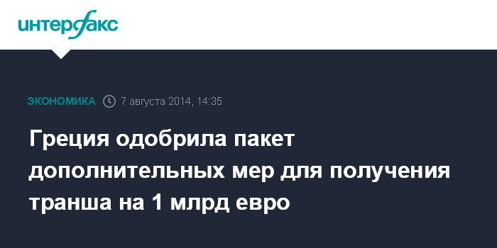 Москва. 7 августа. INTERFAX.RU - Парламент Греции одобрил пакет дополнительных антикризисных мер для получения очередного транша международной финансовой помощи на 1 млрд евро, пишет The Wall Street Journal.