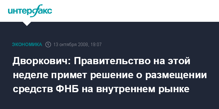 В понедельник на встрече с президентом Дмитрием Медведевым А.Дворкович сообщил, что решение правительства РФ о размещении средств ФНБ на внутреннем рынке будет принято на текущей неделе.