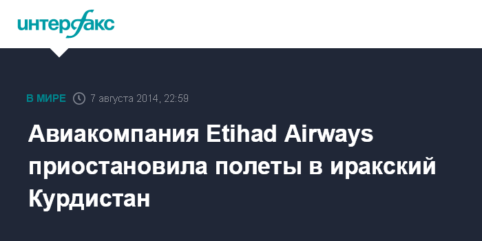 Москва. 7 августа. INTERFAX.RU - Авиакомпания Etihad Airways из ОАЭ объявила в четверг о приостановке полетов в столицу иракского Курдистана Эрбиль из-за продолжающихся боев в северном Ираке, сообщила газета Wall Street Journal со ссылкой на заявление авиакомпании.