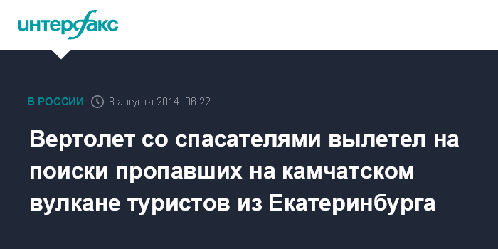 Москва. 8 августа. INTERFAX.RU - Вертолет Ми-8 местной авиакомпании "Витязь-Аэро" со спасателями на борту вылетел в район вулкана Камень на поиски троих пропавших туристов, сообщил агентству "Интерфакс - Дальний Восток" представитель ГУ МЧС России по Камчатскому краю в пятницу.