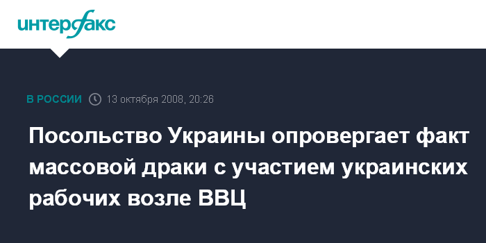 Москва. 13 октября. INTERFAX.RU - Посольство Украины в России опровергает факт широкомасштабной драки при участии украинских рабочих возле Всероссийского выставочного центра в Москве, сообщает пресс-служба украинского МИД в понедельник.
