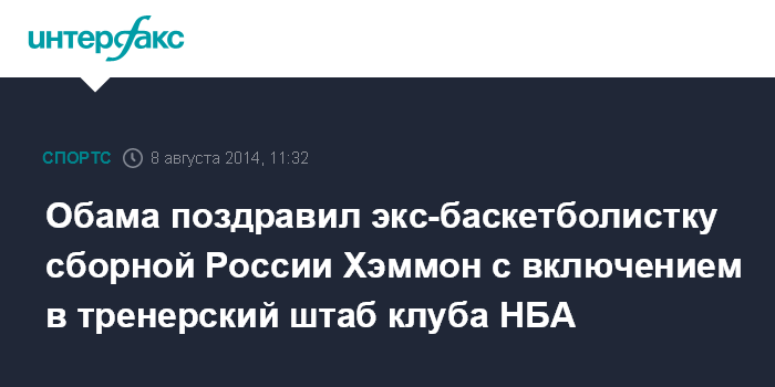 Москва. 8 августа. INTERFAX.RU - Президент США Барак Обама не оставил без внимания факт назначения на должность ассистента главного тренера клуба Национальной баскетбольной ассоциации (НБА) "Сан-Антонио" бывшей разыгрывающей сборной России Бекки Хэммон.
