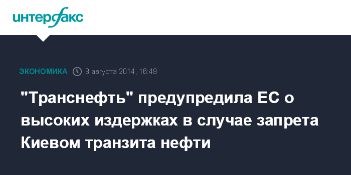 Москва. 8 августа. INTERFAX.RU - Россия сможет переориентировать потоки транзита нефти в случае запрета ее транзита по территории Украины, но страны ЕС, покупающие российскую нефть, столкнутся с более высокими издержками, заявил "Интерфаксу" пресс-секретарь "Транснефти" Игорь Демин.