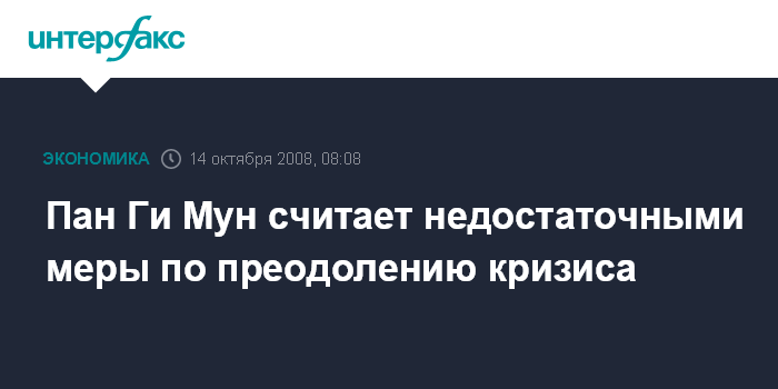 "Согласованные действия, предпринятые министрами финансов ключевых экономических держав, затронутых (кризисом), а также Международным валютным и финансовым комитетом МВФ в Вашингтоне в эти выходные, нацеленные на восстановление доверия на финансовых рынках, достойны высоких оценок, однако для восстановления капитализации банковской системы и гарантирования (сохранности) сбережений обычных людей необходимы более скоординированные подходы, включая прямое вмешательство правительств основных экономических держав", - говорится в заявлении Пан Ги Муна, распространенном в понедельник в штаб-квартире ООН.