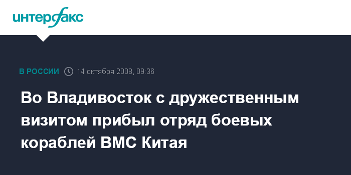 Москва. 14 октября. INTERFAX.RU - На главную базу Тихоокеанского флота (ТОФ), порт Владивосток, с неофициальным визитом прибыл отряд боевых кораблей Военно-морских сил Народно-освободительной армии (НОАК) КНР в составе эсминца "Тай Чжоу" и ракетного фрегата "Ма Аньшань".