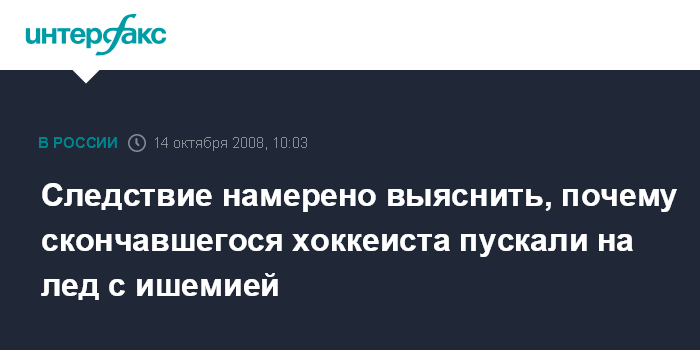 "Соответствующие материалы будут истребованы из органов внутренних дел, и будет проведена проверка для выяснения, в частности, почему спортсмен с таким заболеванием выходил на лед", - заявила "Интерфаксу" во вторник официальный представитель подмосковного управления СКП РФ Юлия Жукова, отметив при этом, что, "по предварительным данным, хоккеист страдал ишемической болезнью сердца".