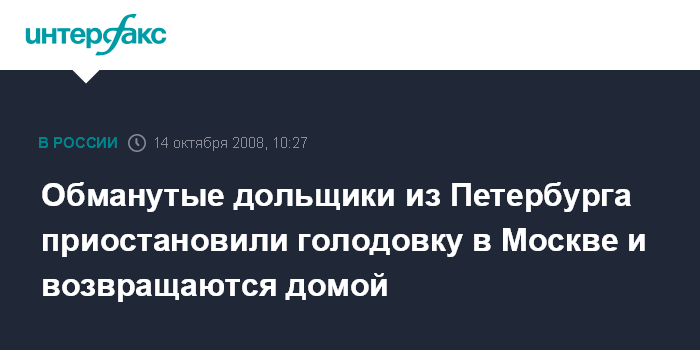 Москва. 14 октября. INTERFAX.RU - Петербургские обманутые дольщики приостановили голодовку, которую проводили в одной из гостиниц в районе Китай-города в Москве.