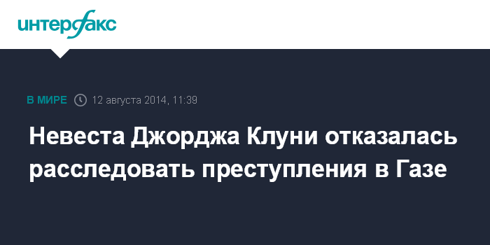 Москва. 12 августа. INTERFAX.RU - Британский адвокат ливанского происхождения Амаль Аламуддин отказалась войти в состав комиссии ООН, которая займется расследованием нарушений прав человека и военных преступлений в секторе Газа, сообщает The Daily Telegraph.