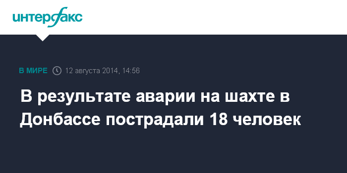 Москва. 12 августа. INTERFAX.RU - В результате вспышки газопылевой смеси на ПАО "Шахтоуправление "Покровское" в Красноармейском районе Донецкой области пострадали 18 работников предприятия, поиски еще двух шахтеров продолжаются.