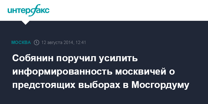 Москва. 12 августа. INTERFAX.RU - Информированность жителей столицы о предстоящих выборах в Мосгордуму 14 сентября недостаточна, считает мэр столицы Сергей Собянин. "Необходимо самым серьезным образом усилить информационную работу, рассказать, когда пройдут выборы, важность, значимость этих выборов", - сказал он на заседании президиума правительства Москвы во вторник.