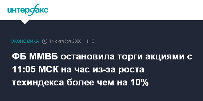ФБ ММВБ остановила торги акциями с 11:05 МСК на час из-за роста техиндекса более чем на 10%