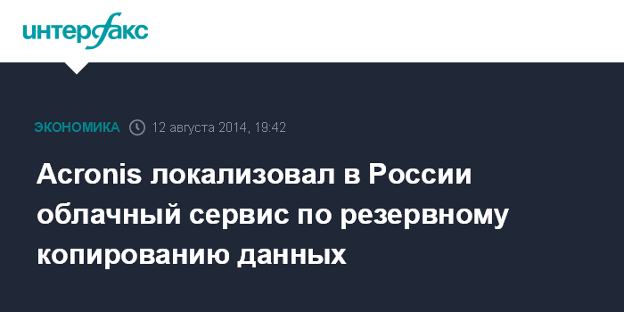 Москва. 12 августа. INTERFAX.RU - Компания Acronis локализовала в России свой облачный сервис по резервному копированию данных с помощью оператора центров обработки данных (ЦОД) компании DataPro.