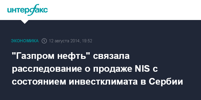 Москва. 12 августа. INTERFAX.RU - "Газпром нефть" связывает расследование о продаже NIS с состоянием инвестклимата в Сербии, заявил в ходе телефонной конференции первый заместитель гендиректора "Газпром нефти" Вадим Яковлев.