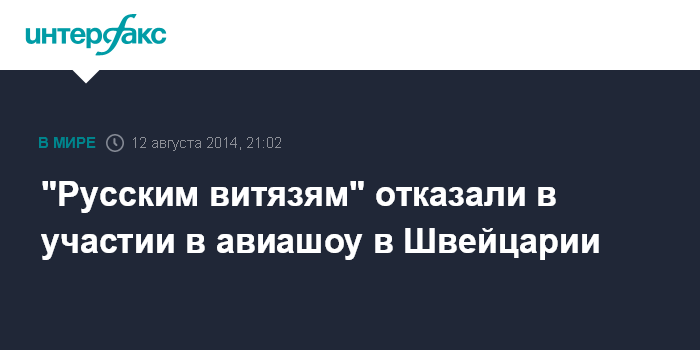 Москва. 12 августа. INTERFAX.RU - Швейцарское министерство обороны решило отменить участие пилотажной группы "Русские витязи" в показательных выступлениях в Швейцарии, намеченных на 30-31 августа и 6-7 сентября.