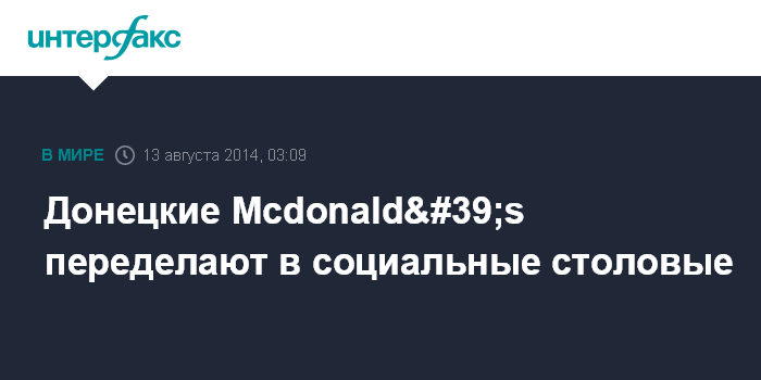 Москва. 13 августа. INTERFAX.RU - Помещения сети ресторанов быстрого питания Mcdonald's в Донецк будут использоваться в качестве столовых для малообеспеченных семей в Донецке.