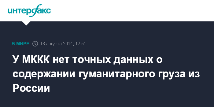 Москва. 13 августа. INTERFAX.RU - Международный комитет Красного Креста (МККК) пока не располагает полной информацией о содержимом грузовиков российской колонны с гуманитарной помощью для Украины, технические детали передачи груза также находятся в стадии разработки, сообщил координатор по связям с общественностью МККК Андре Лерш.