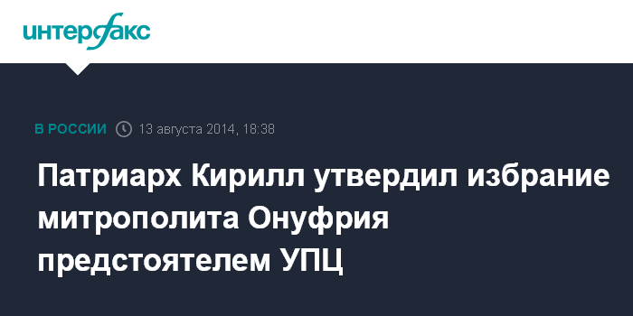 Москва. 13 августа. INTERFAX.RU - Патриарх Московский и всея Руси Кирилл утвердил решение Собора епископов Украинской православной церкви об избрании митрополита Онуфрия ее предстоятелем, сообщила в среду вечером пресс-служба патриарха.