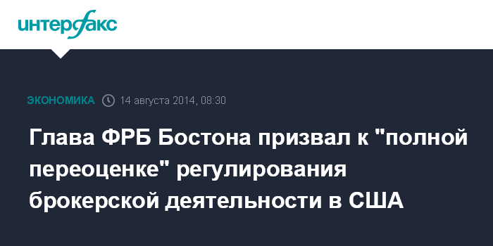 Москва. 14 августа. INTERFAX.RU - Регулирование брокерской деятельности в США требует "полной переоценки", полагает президент Федерального резервного банка (ФРБ) Бостона Эрик Розенгрен.