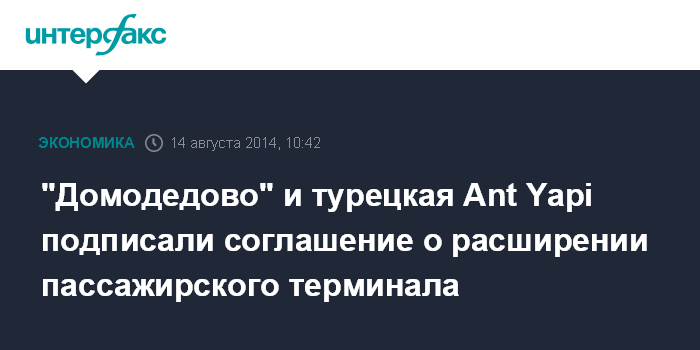 Москва. 14 августа. INTERFAX.RU – Аэропорт "Домодедово" и турецкий холдинг Ant Yapi подписали соглашение о расширении пассажирского терминала (Т2), пишет в четверг газета "Ведомости" со ссылкой на представителя аэропорта.