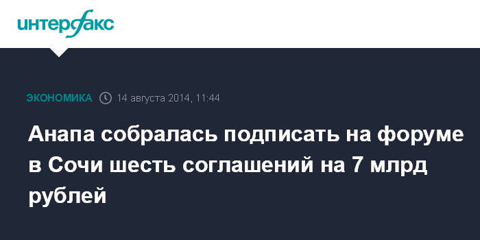 Москва. 14 августа. INTERFAX.RU - Власти Анапы планируют подписать на XIII Международном инвестиционном форуме "Сочи-2014" 6 соглашений на общую сумму около 7 млрд рублей, сообщил глава города Сергей Сергеев в интервью "Интерфаксу".