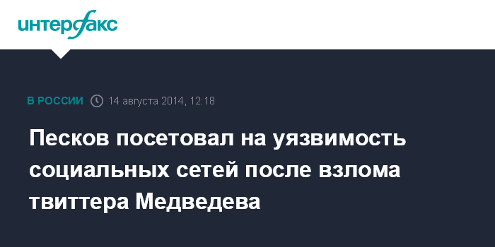 Москва. 14 августа. INTERFAX.RU - Взлом твиттера премьер-министра Дмитрия Медведева подтверждает необходимость обеспечения информационной безопасности, считает пресс-секретарь президента Дмитрий Песков.