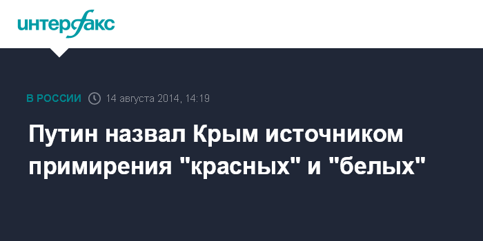 "Крым может сыграть уникальную объединяющую роль для России, стать своего рода историческим источником примирения "красных" и "белых" для того, чтобы мы окончательно залечили раны, нанесенные нашему народу драматическим расколом 20 века", - сказал Путин в четверг в Ялте на встрече с членами думских фракций.