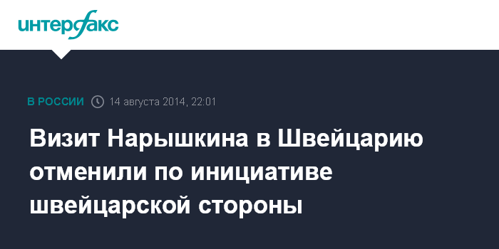 Москва. 14 августа. INTERFAX.RU - Швейцарские власти приняли решение отменить официальный визит в эту страну спикера Государственной Думы РФ Сергея Нарышкина, сообщили в четверг в парламенте Швейцарии.