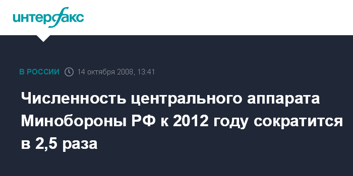 Москва. 14 октября. INTERFAX.RU - Министр обороны РФ Анатолий Сердюков сообщил журналистам, что к 2012 г. численность центрального аппарата Минобороны РФ сократится в два с половиной раза.