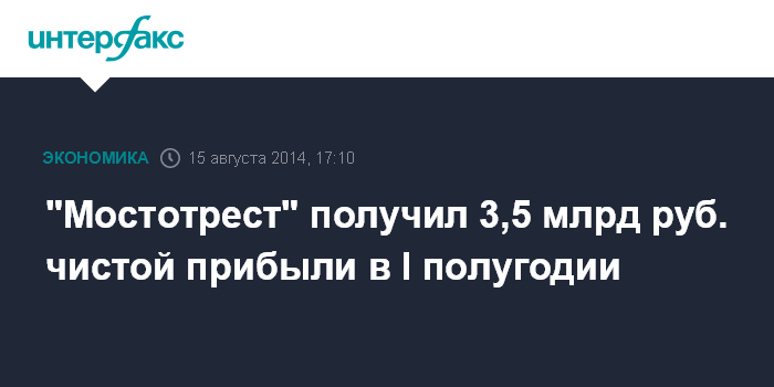 Москва. 15 августа. INTERFAX.RU - "Мостотрест" получил 3,515 млрд руб. чистой прибыли по РСБУ в I полугодии против убытка годом ранее, следует из ежеквартального отчета компании.