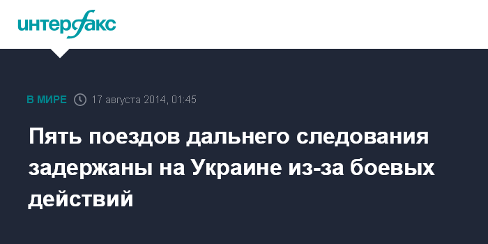 Москва. 17 августа. INTERFAX.RU - На Украине из-за боевых действий Донецкая железная дорога в субботу не смогла отправить пять поездов дальнего следования.