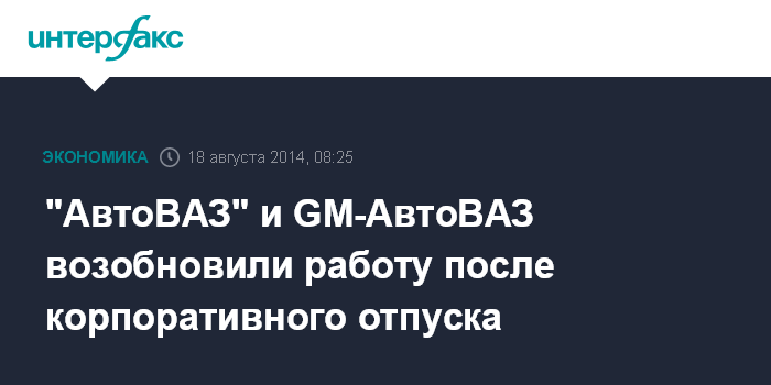 Москва. 18 августа. INTERFAX.RU - "АвтоВАЗ" и ЗАО "GM-АвтоВАЗ" (совместное предприятие General Motors и ОАО "АвтоВАЗ" в Тольятти) в понедельник возобновили работу после корпоративного отпуска.