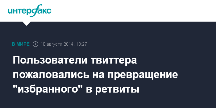 Москва. 18 августа. INTERFAX.RU - Сервис микроблогов Twitter стал отображать твиты, занесенные в "избранное", как ретвиты. Об этом, как пишет The Next Web, сообщили некоторые пользователи соцсети.