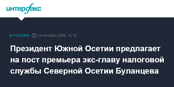 Москва. 14 октября. INTERFAX.RU - Президент Южной Осетии Эдуард Кокойты предложил парламенту утвердить в должности премьер-министра республики Асламбека Буланцева, ранее занимавшего должность главы Федеральной налоговой службы по Северной Осетии. Кандидатуру Буланцева Кокойты предложил на встрече с депутатами во вторник.